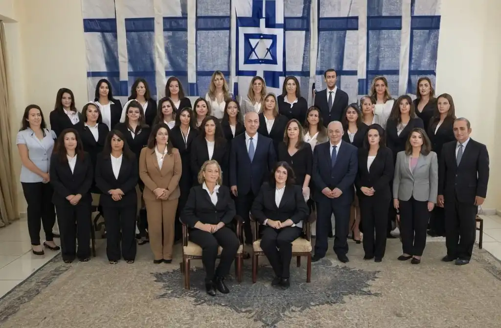 一群30名妇女站在一张官方照片中,身后挂着以色列国旗,她们在一个受人尊敬的机构的房间里,她们都穿着西装,在中间的人是两个女人坐在椅子上