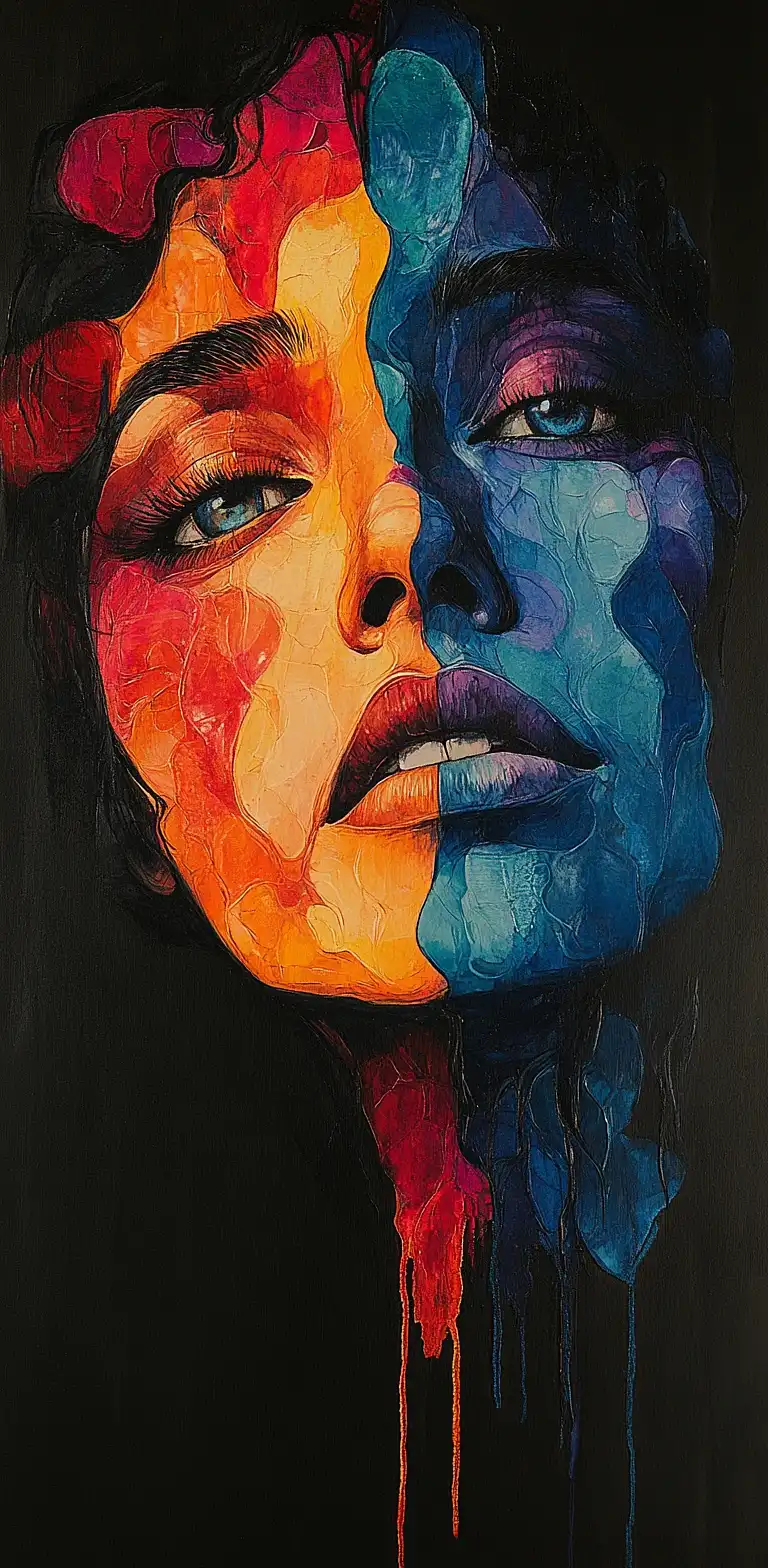 时尚社论,一个黑暗的短篇美丽的裸体女人的特写肖像,闭着眼睛在工作室涂上霓虹灯闪亮的色彩脸,highres,逼真的照片,专业摄影,电影角度,动态光背照