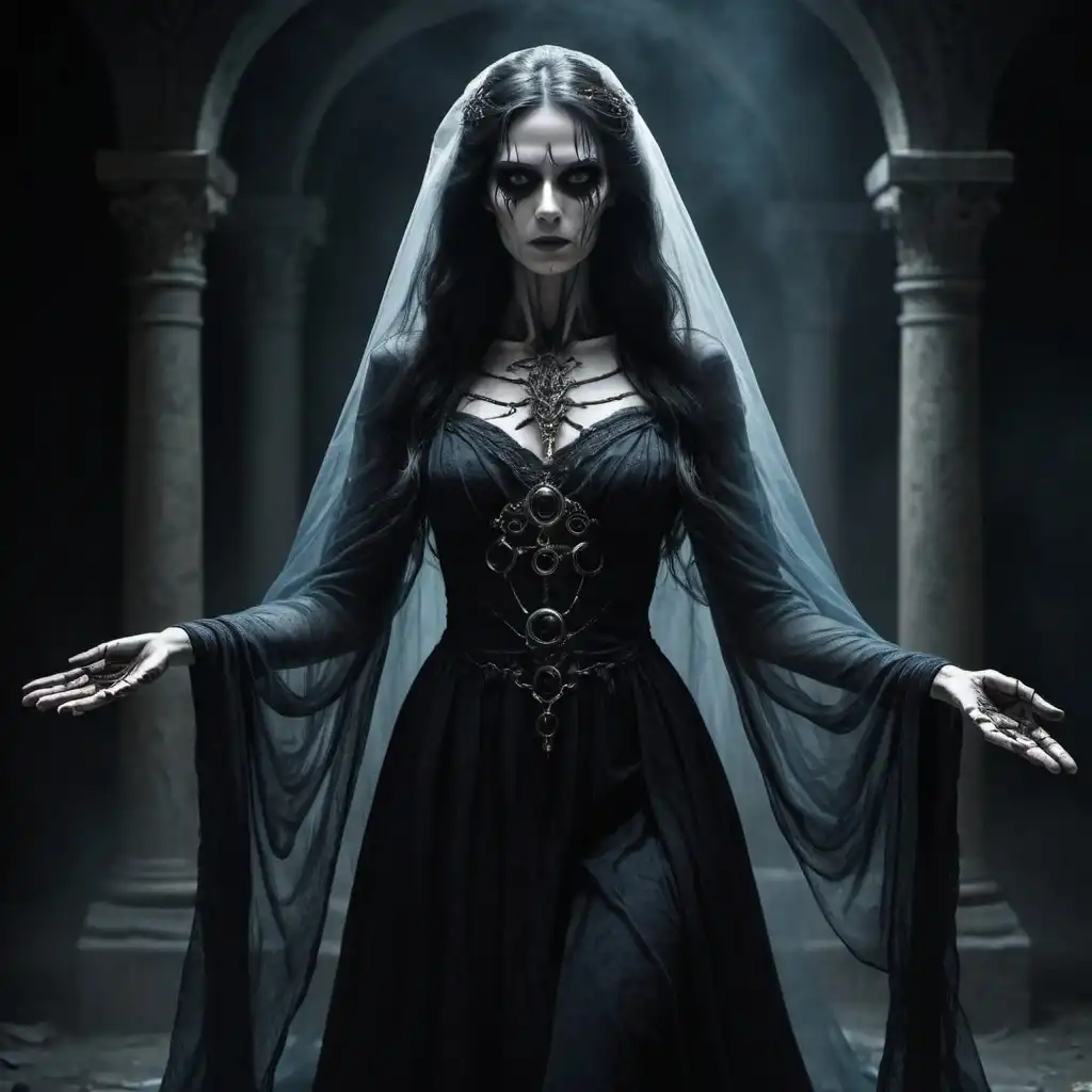 成年非洲妇女的电影肖像,棕色的眼睛,深色的非常卷曲的长发,鲜明的特征,古埃及装束,深色晒黑的皮肤,细节特征,民族战士装束,皮革和红色和橙色服装,大气照明,沙漠寺庙背景,highres,4:5比例,暖色调,专业,电影,不畏凝视
