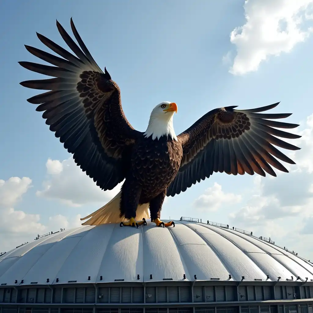 Enormous bald eagle with its wings outstretched to showcase its plumage is sitting on the Vince Lombardi NFL Trophy, with the Super Bowl trophy clutched in its powerful talons. Crowded stadium background High detail & quality, 8k, pro photo.