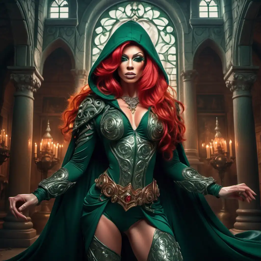 a bright red haired, muscular, caucasian drag queen rogue, in a dark green hooded clothes with ornaments, dynamic full body pose, dark eye makeup, dark lipstick, A surreal, dreamlike scene .This stunning image captures the essence of a powerful character, rendered in intricate detail and the meticulous depiction of flowing hair, intricate armor, and determined expression. An old castle in backgraund