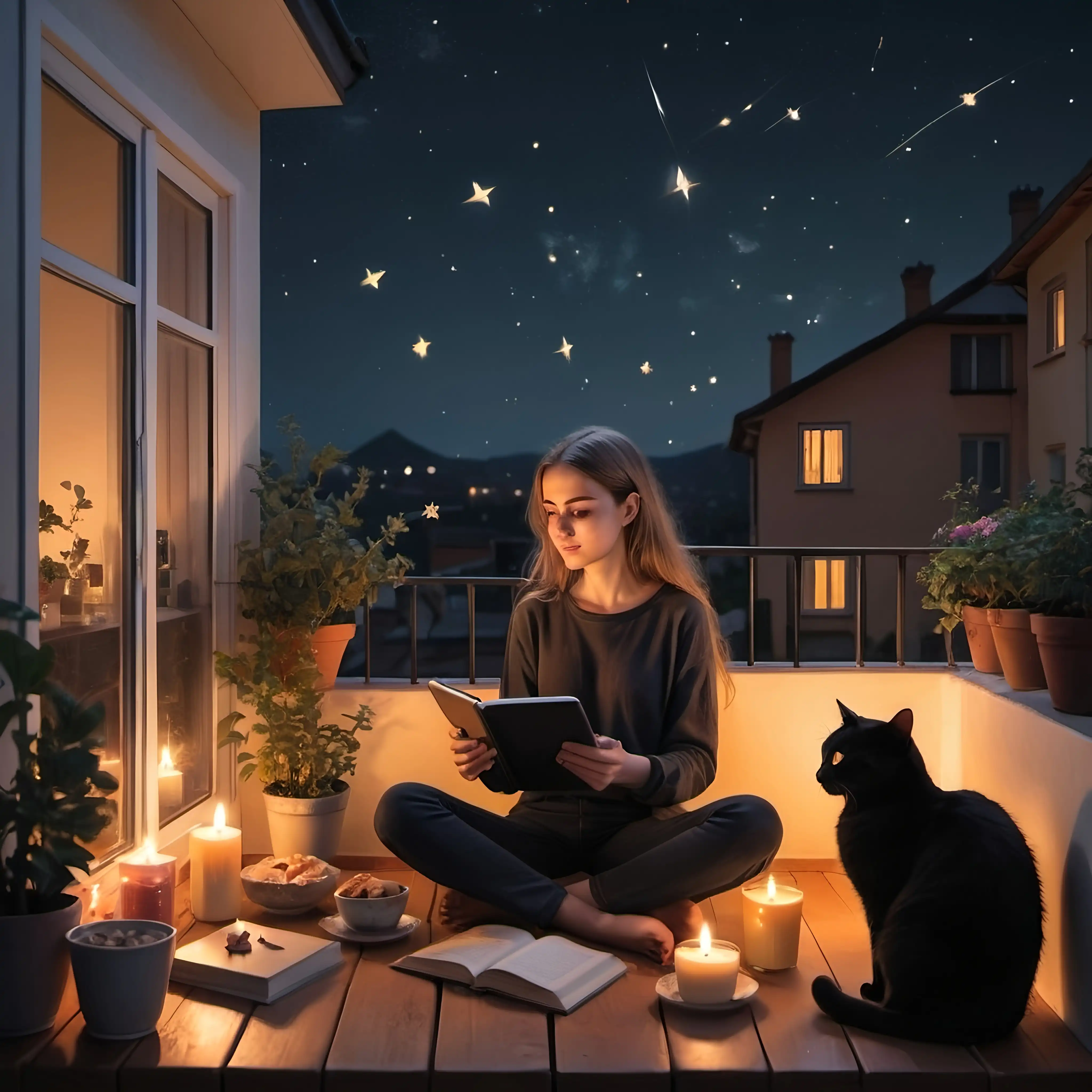 a beautiful illustration of a semi chubby built Filipina woman in her 30's, with long textured wavy dark brown hair, sitting with her calico cat on her lap, watching the stars in her balcony, wearing a beautiful vintage mini white floral dress, with the moon illuminating her face, a cupcake on a place and some coffee placed on the floor near her, and a cat bowl with dry cat food for her pet cat, twilight hues, cinematic effect, realistic