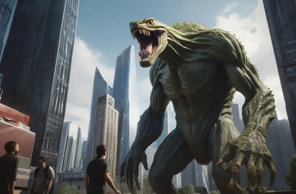 Satan looks like the traditional devil from Christian theocracy. He is red, tall, muscular, two horns upon his head, yellow eyes; he does not have fangs but he does have a sad, toothy smile.