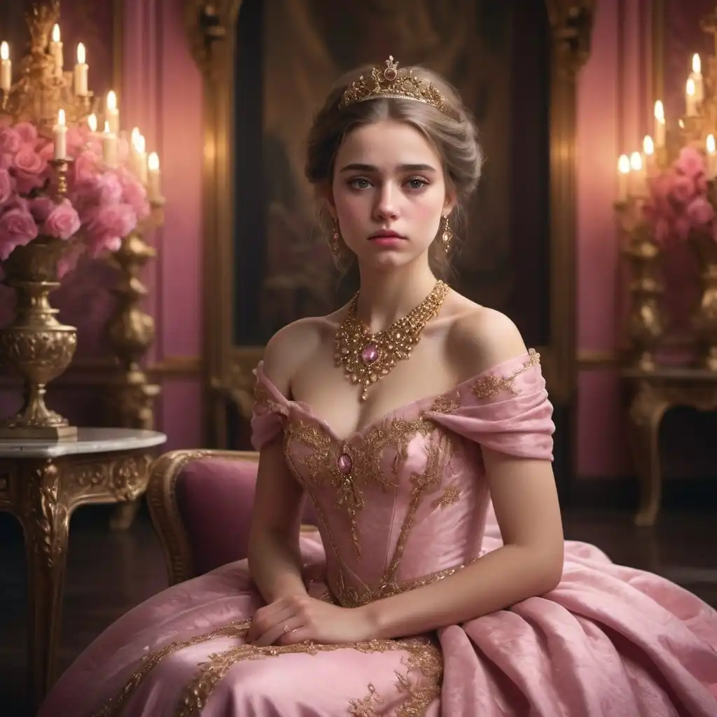 Evil queen in a pick gown sitting on a throne with diamond jewellery and white hair