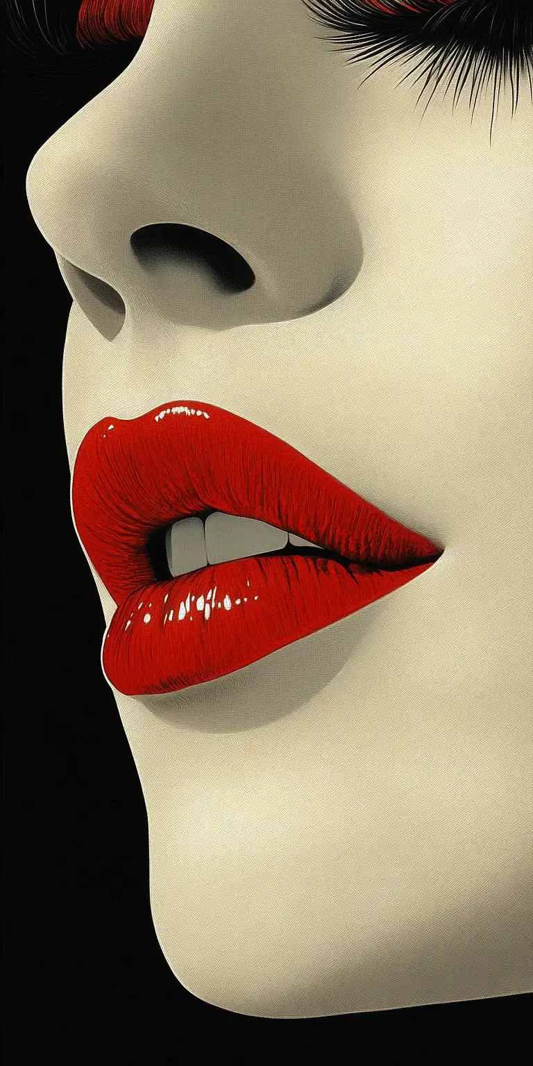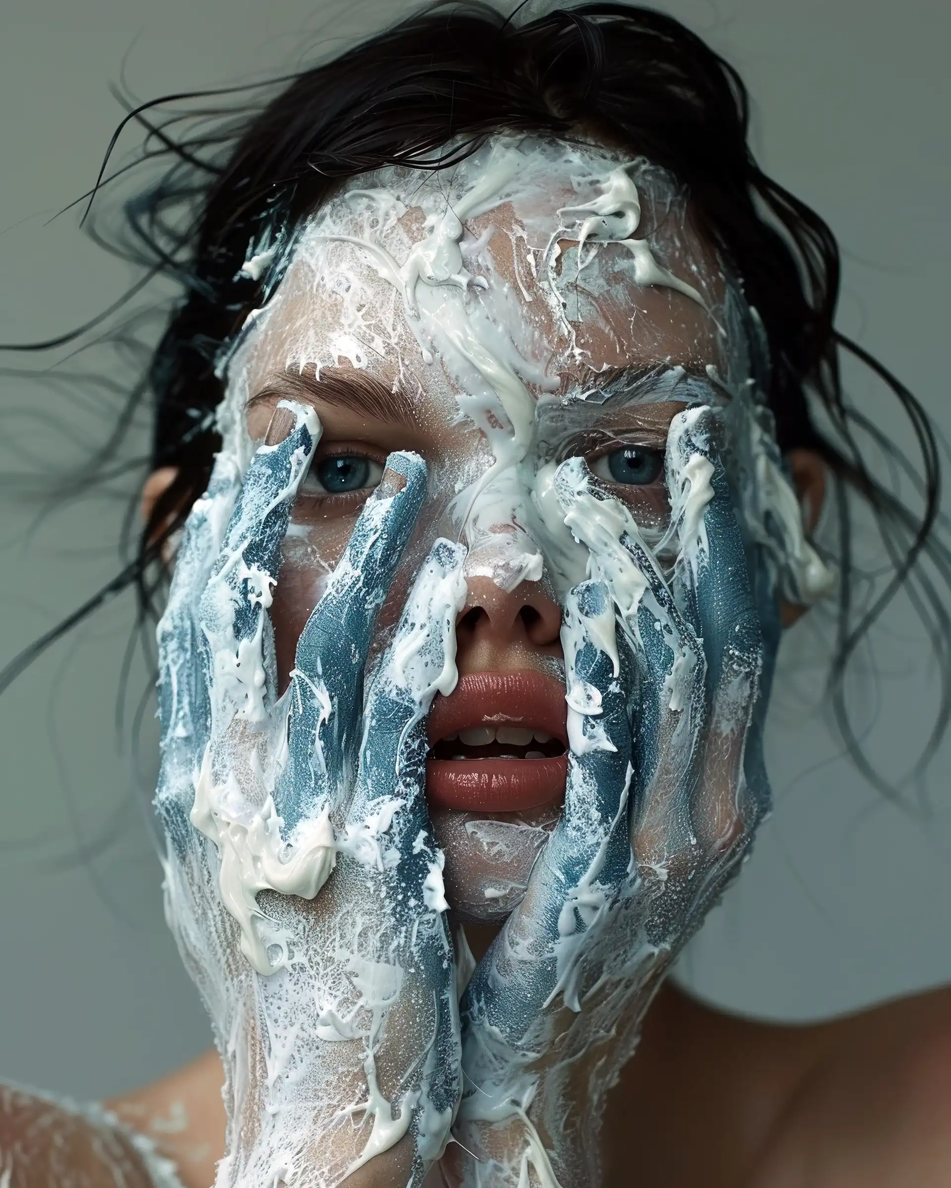 Abtract expressionism: 一位年轻女子的详细肖像,深棕色的头发造型松散,淡褐色的眼睛,柔和的腮红和发光的皮肤。抽象的背景和苦恼的纹理。