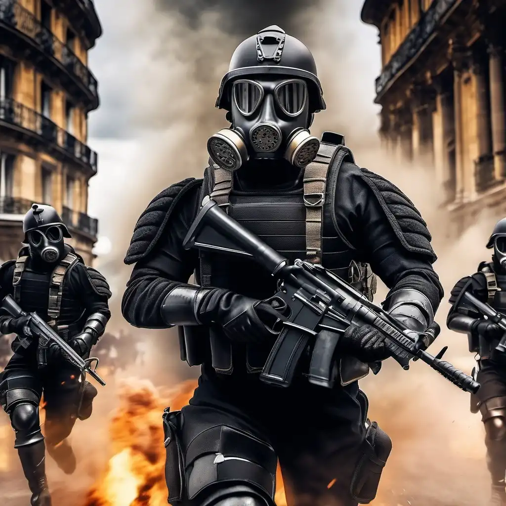 Templar in power armour, fps, knight face mask, red cross on chest, background paris on fire