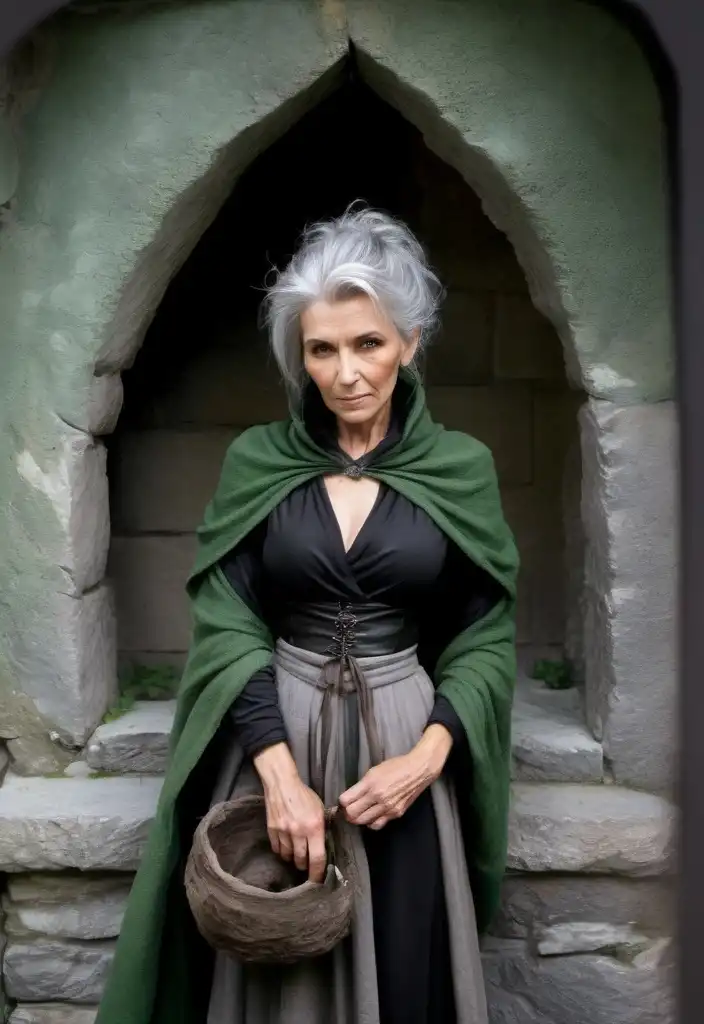 创建一个60岁的女人发生1942年,她有一个白色的衣服,她有灰色的金发穿着它,她有一个破碎的鼻子,绿色的眼睛