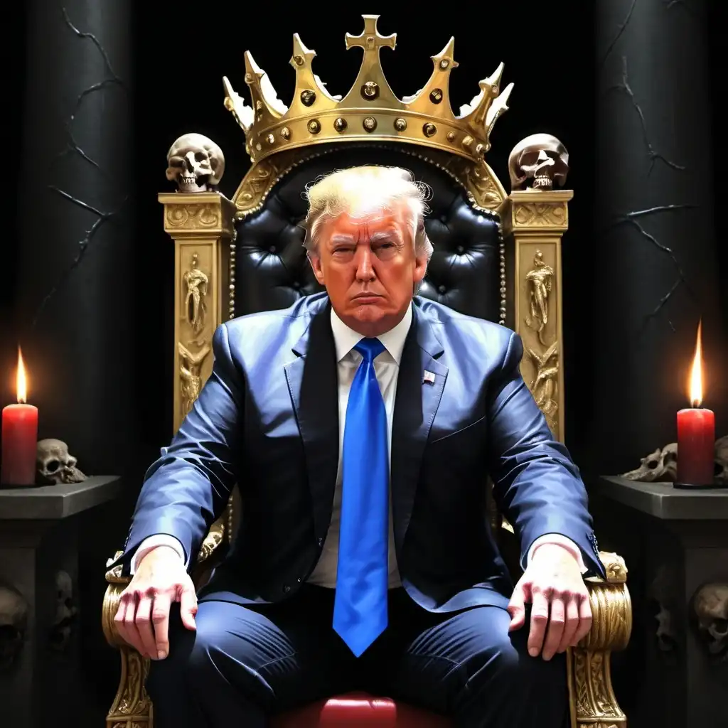 realistic illustration of Donald Trump, he is the Antichrist, the lord of lies, the king of chaos, he is the great deceiver the enemy of man, he brings fascism to America, great evil rules the land, he is miserable, evil, greedy, he gets great pleasure out of causing others pain, he shall bring about the apocalypse, he sits upon a throne made of bones and skulls