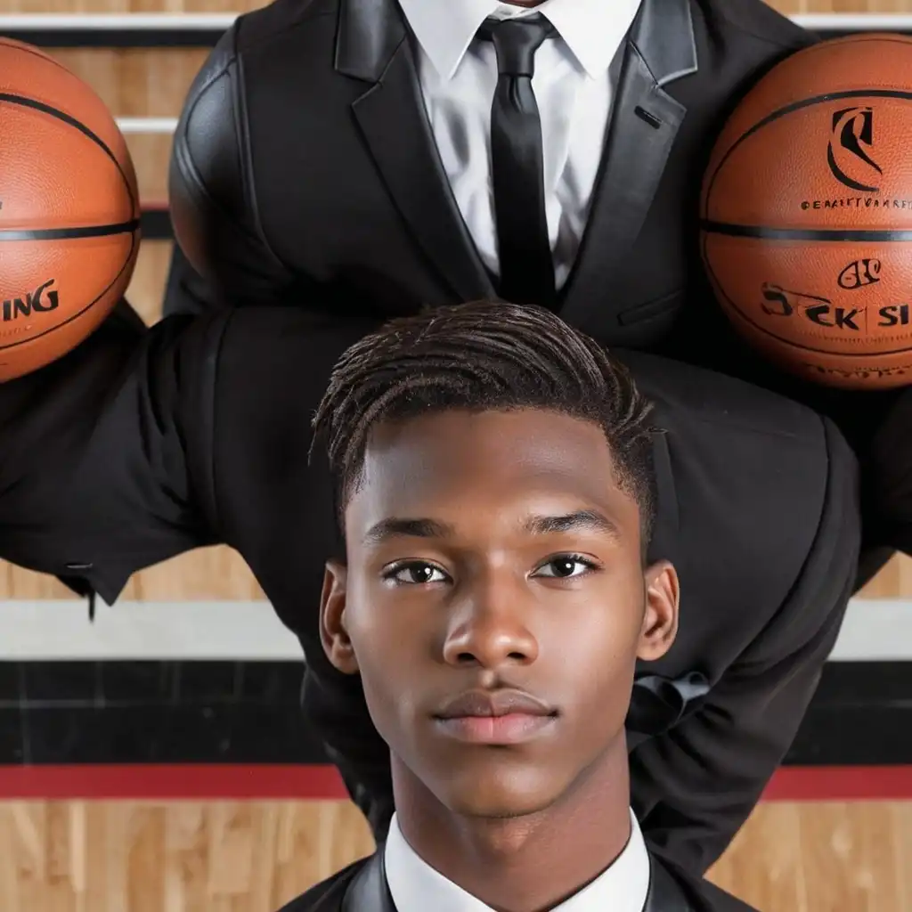 a 19 year old man wearing a tuxedo and black leather formal shoes, beautiful male face, miles morales, whole body portrait, in a basketball court, tim hildebrant, giga chad capaybara