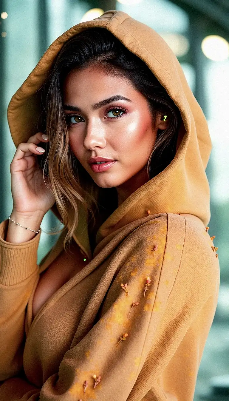An enthralling photograph of voluptuous Jessica Chastin, exuding both grace and fierce determination, as she poses in an elevator with four full-length wall mirrors. She has stylish long black curly hair, perfecting her look. Clad only in a white semitransparent nightgown. The mirrors amplify her allure, creating a captivating and dynamic scene, cinematic, photo, vibrant