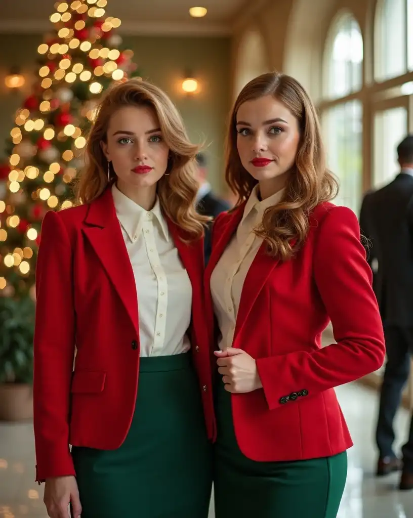 (photorealistic) two beautiful curvy young women, (cinnamon-blonde hair), wearing vintage 60s-style red tartan blazers white blouses & green tweed wool skirts, standing gracefully in a crowded mid-century lobby, adorned with a lavish Christmas tree and charming holiday decorations, (Mad-Men style), (perfectly detailed faces), vibrant colors, festive ambiance, capturing the essence of the season, (ultra-detailed), (8K), well lit, professional photography quality.