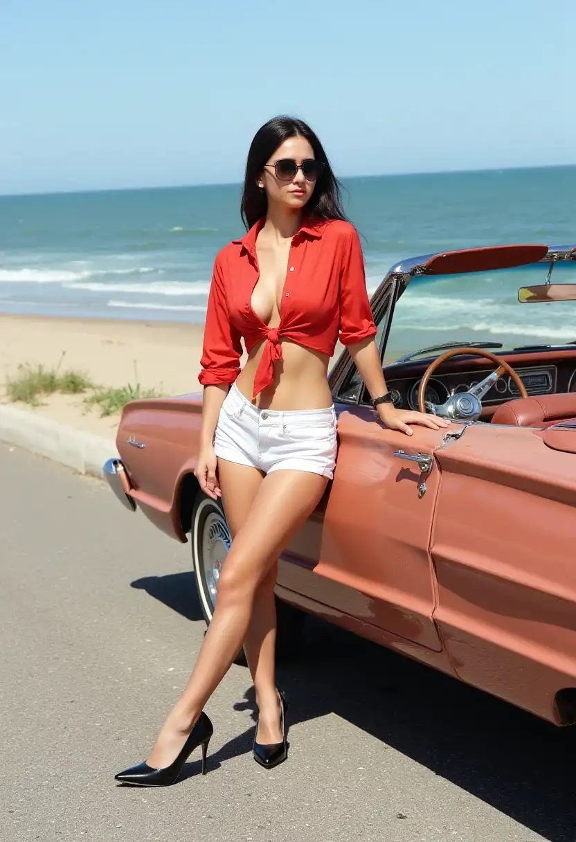 A highly attractive blonde woman who is a flight attendant is standing on an airplane bathroom. She is wearing navy blue lace lingerie. The photo is taken with a high-resolution camera. she holds on left hand her white blouse and dark skirt. The background includes typical elements of an airplane toilet. The scene is vibrant and elegant, focusing on women's features, and clothing. Perfect face, simetrical face, simetrical eyes,