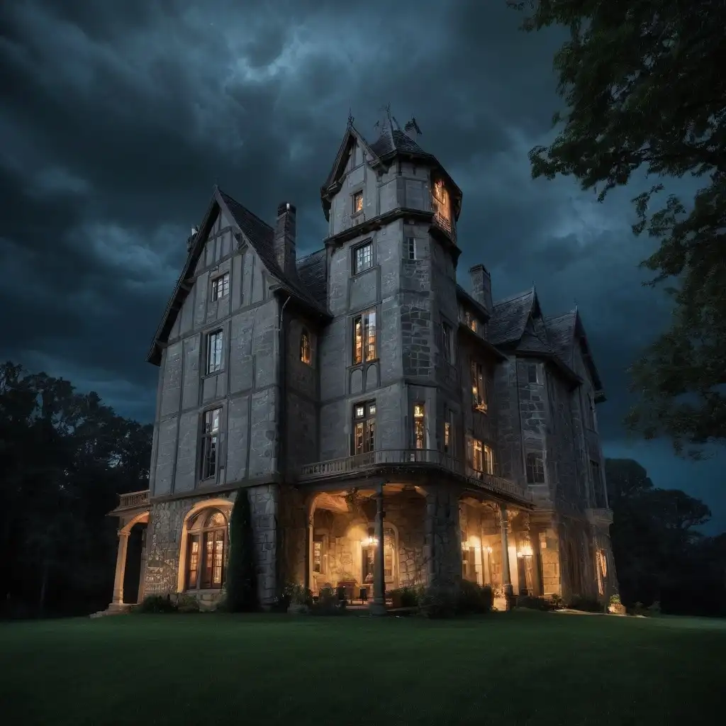a fifteenth century six story stone mansion in a country setting. nighttime, stormy, impressionist