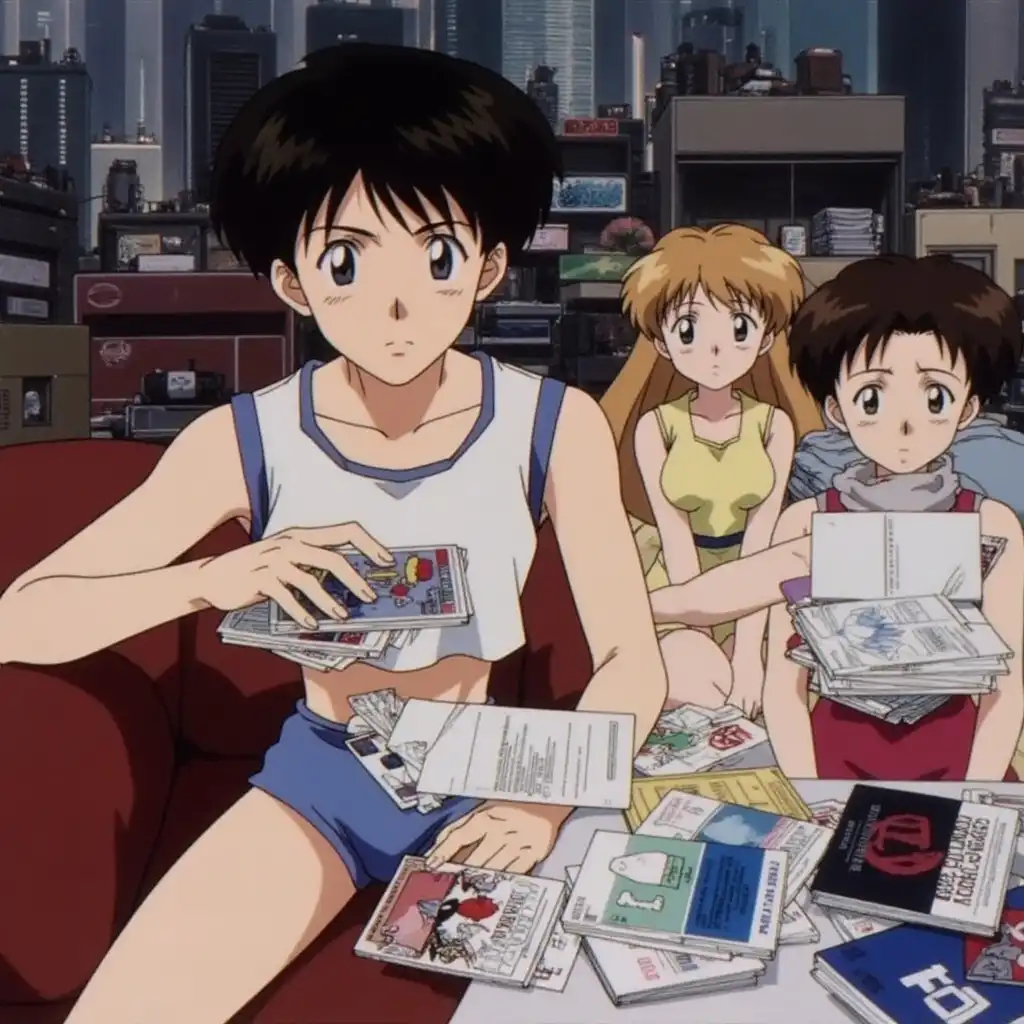 a group of anime characters standing around each other in a room with a woman pointing at the camera and a man pointing at the camera, Eizan Kikukawa, shock art, manga and anime 1 9 9 9, a screenshot