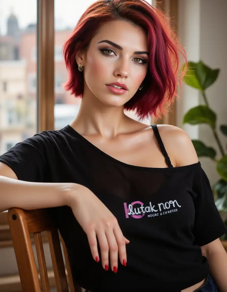 This extreme close-up photograph of a young woman with vibrant red hair and striking blue eyes is captured in a moment of quiet contemplation. She's wearing a cozy orange beanie over her dark auburn hair, adding a pop of warmth to the scene. Her expression is thoughtful as she gazes off to the side. The background is a simple gray wall, providing a neutral backdrop that allows her to stand out. The lighting in the image is soft and diffused, casting gentle shadows on her face and creating a serene atmosphere. The overall style of the image is realistic with a touch of warmth, thanks to the orange beanie and the soft lighting.