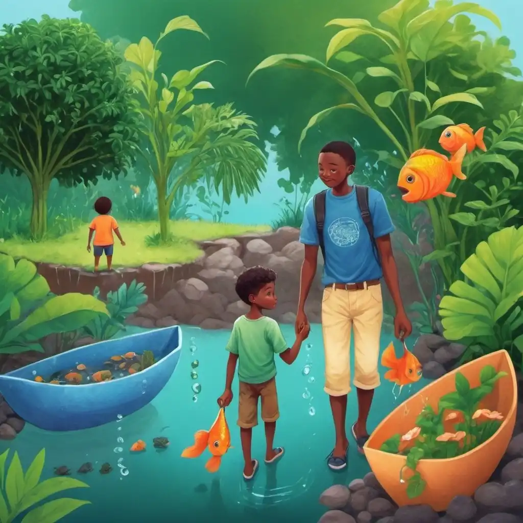 create a vibrant illustration of a boy -Timi and his father walking by the river with fishermen in boats.