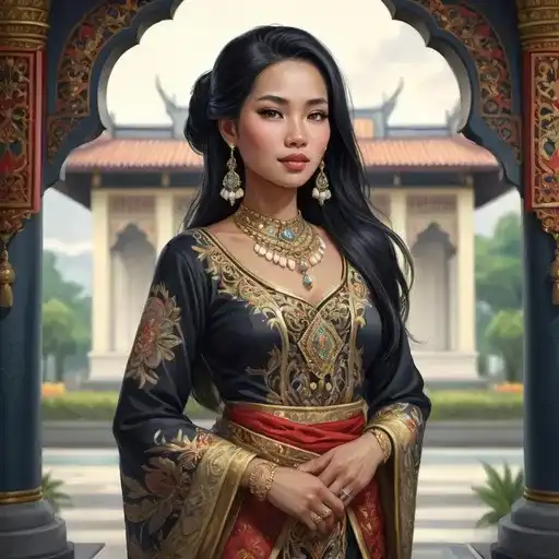 全身,女性马来亚乡村女孩的幻想插画,17岁,快乐的表情,传统服装,黑发,高质量,rpg-幻想,详细,马来亚乡村背景