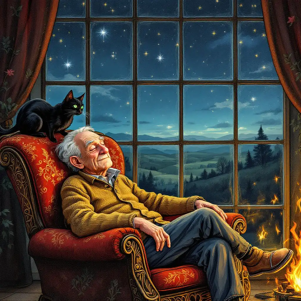 A grizzled, rugged man with a thick, braided full beard and piercing brown eyes sits astride a majestic, scaly raptor, its body a mix of dark greens and greys, its eyes glowing like embers in the night. The man's worn, leather-bound armor is adorned with numerous dino-tooth trophies, and he grasps a mighty, silver-hilted sword with a worn, brown leather-wrapped handle. The raptor's powerful legs are tense, ready to leap, as the duo perch atop a craggy, rocky cliff, the night sky behind them a deep shade of indigo, with stars twinkling like diamonds. In the distance, the silhouette of a dense, prehistoric forest looms, with misty vapors rising from the treetops. The man's face is set in a determined, battle-hardened expression, his skin weathered from years of adventuring.