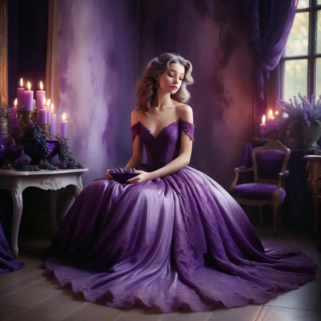 数字水彩画,女人在一个房间里穿着飘逸的紫色舞会礼服,墙壁上披着深紫色的天鹅绒,地板上有光泽的紫水晶,反射着闪烁的蜡烛光,桌子上覆盖着薰衣草色的花边布,一个装满葡萄的紫色瓷碗,油漆飞溅,黑色和红色,粗体笔触,新艺术风格