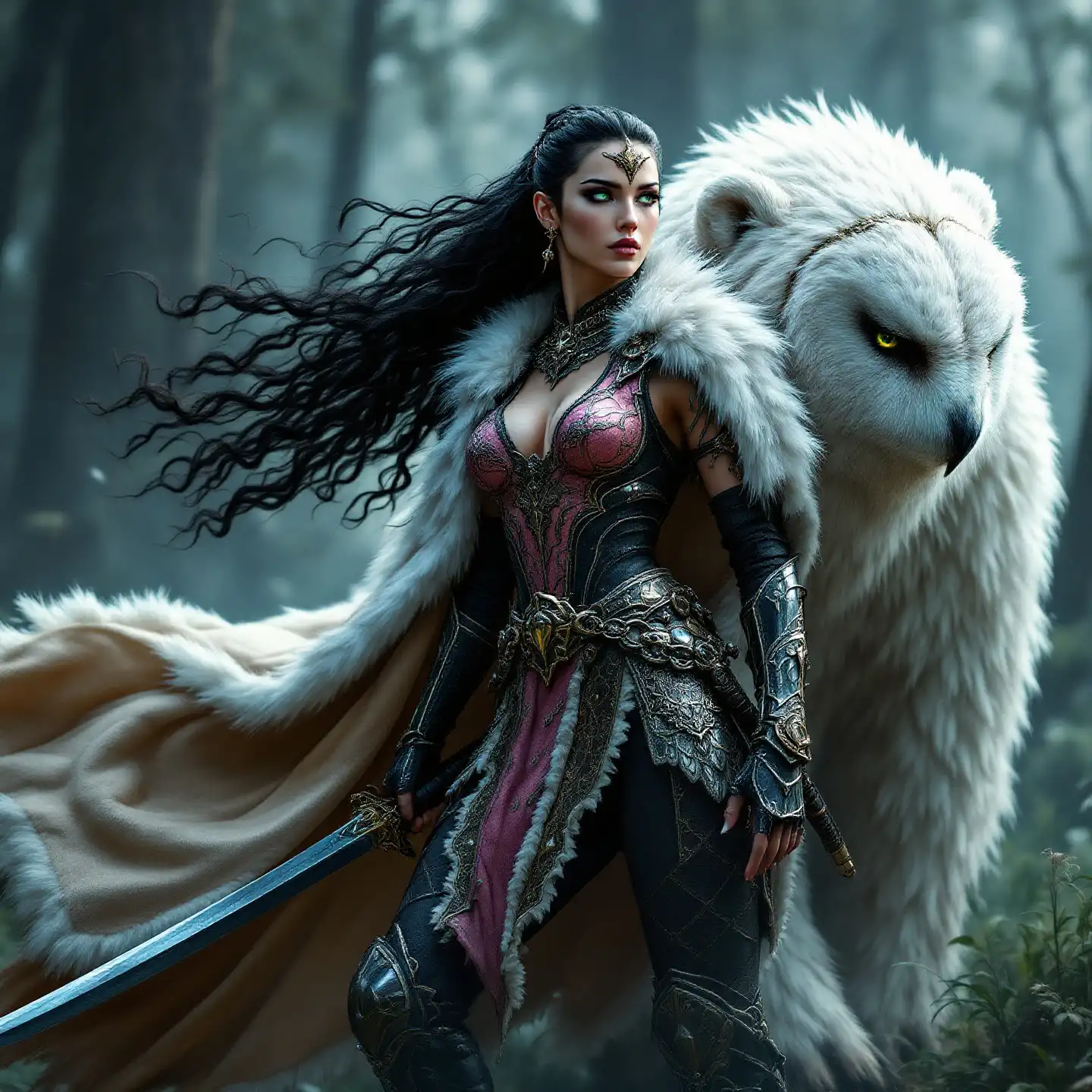 full-body image, slender athletic female warrior, wearing intricately detailed dark pink and black metallic chainmail armor with boots, majestic white and gold fur lined cloak billowing in the wind, holding a samurai sword, extremely long curly red hair flowing down to the ground, elegant crown on her head, brilliant green eyes, her body adorned in magnificent tattoos, poised stance exuding strength, dynamic pose standing next to a green and black dragon with its shimmering scales and giant wings unfurled, detailed armor textures reflecting light, dramatic shadows, mystical forest background, ethereal ambiance, cool color tones, high definition, ultra-detailed, captivating and heroic atmosphere.