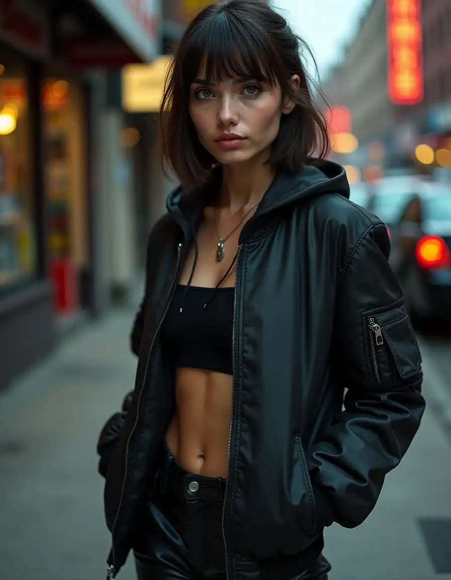 A woman with short hair and a vibrant pink streak stands confidently against a window. She is dressed in a casual black t-shirt adorned with a logo. Her gaze is directed off to the side, her expression serious yet contemplative. The background reveals a cozy room with a wooden floor and a plant adding a touch of greenery. The image is captured in a realistic style, with natural lighting that casts soft shadows on the woman's face, enhancing the depth and texture of the scene. The color palette is dominated by cool tones, creating an atmosphere of tranquility and introspection. The focus is sharp on the woman, drawing attention to her thoughtful expression, while the background elements are softly blurred, ensuring that she remains the focal point of the image.