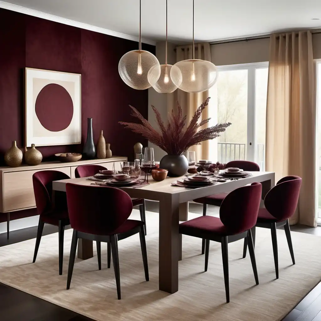 Design a modern kitchen with kitchen using a rich, earthy palette inspired by these materials. Incorporate deep burgundy and wine hues as accent elements, such as on an accent wall, cushions, or rugs, to add warmth and depth. Use beige or cream tones on larger surfaces, like walls or sofas, to create a neutral base. Integrate textured materials like velvet or suede for upholstery to match the tactile richness. Add wooden furniture with natural oak or bamboo finishes for balance, such as a coffee table or shelving units. Use gold or brass accents in light fixtures and decor for subtle elegance. Bring in greenery, such as a potted plant, to harmonize with the natural theme and add freshness. Keep the overall design minimal and cohesive, with clean lines and layered textures to achieve a luxurious yet modern atmosphere."