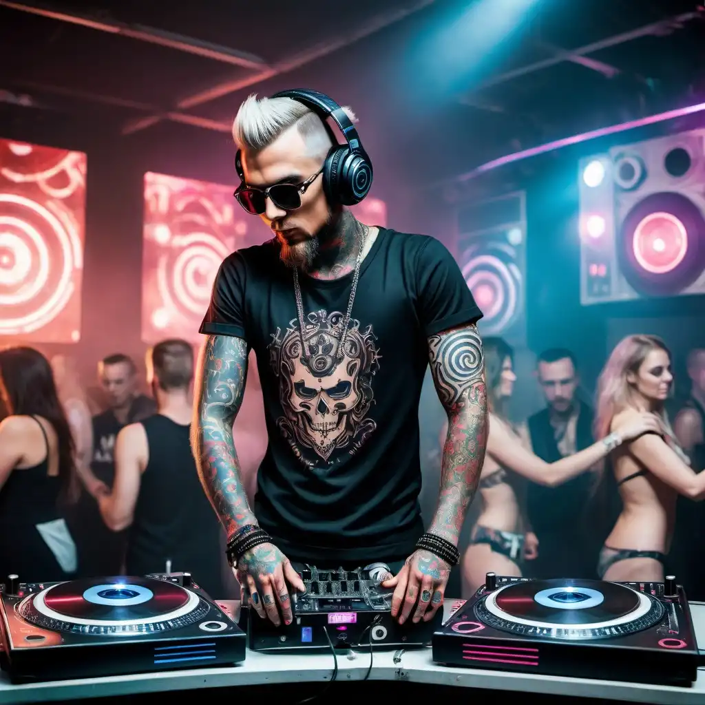 Hyperrealistic Fictional Character, Upscale 4K, Incredibly Finite Details, Highly Detailed Cyberpunk Character, gorgeous muscular 45-year-old Egyptian drag queen (masculine jawline and brow features) with dark eyeshadow, dark lipstick, heavy mascara, and long pink gray hair wearing an Ornate Pendant and Deep V-Neck Shirt and a flattering skirt with thigh high silk stockings and high heel boots, Background is a dark evening cyberpunk city street bustling with vendors, Vibrant Neon Colors