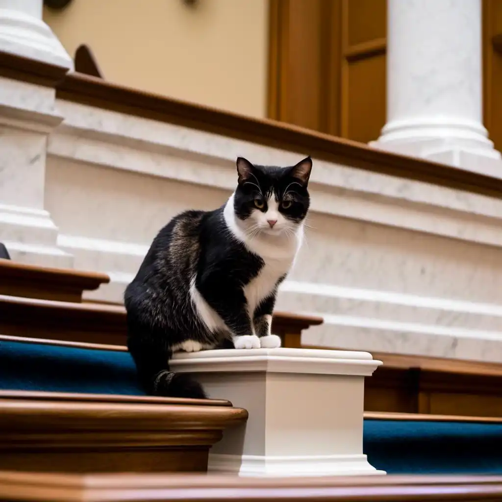 <mymodel> "draw a cat sitting on a legislative podium in the well of a legislative chamber during a legislative session."