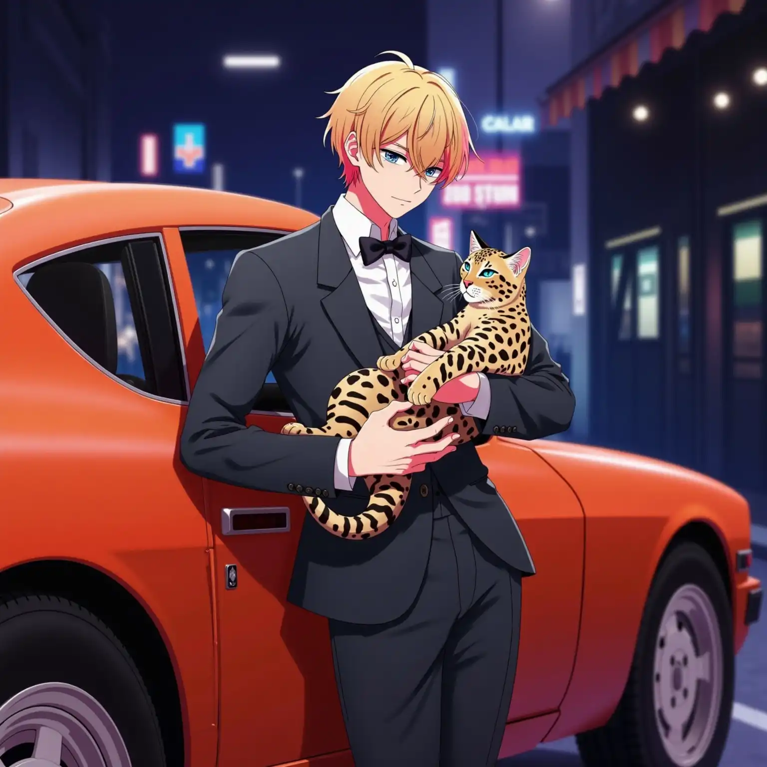 Anime boy, vibrant color scheme, retro arcade style, nostalgic atmosphere, standing confidently next to a classic Datsun 240z, striking colors reminiscent of neon lights, dynamic and engaging pose, visually captivating background with colorful retro elements, high energy vibes, moody atmosphere, digital rendering, intricate details, fantasy-inspired design, energetic backdrop