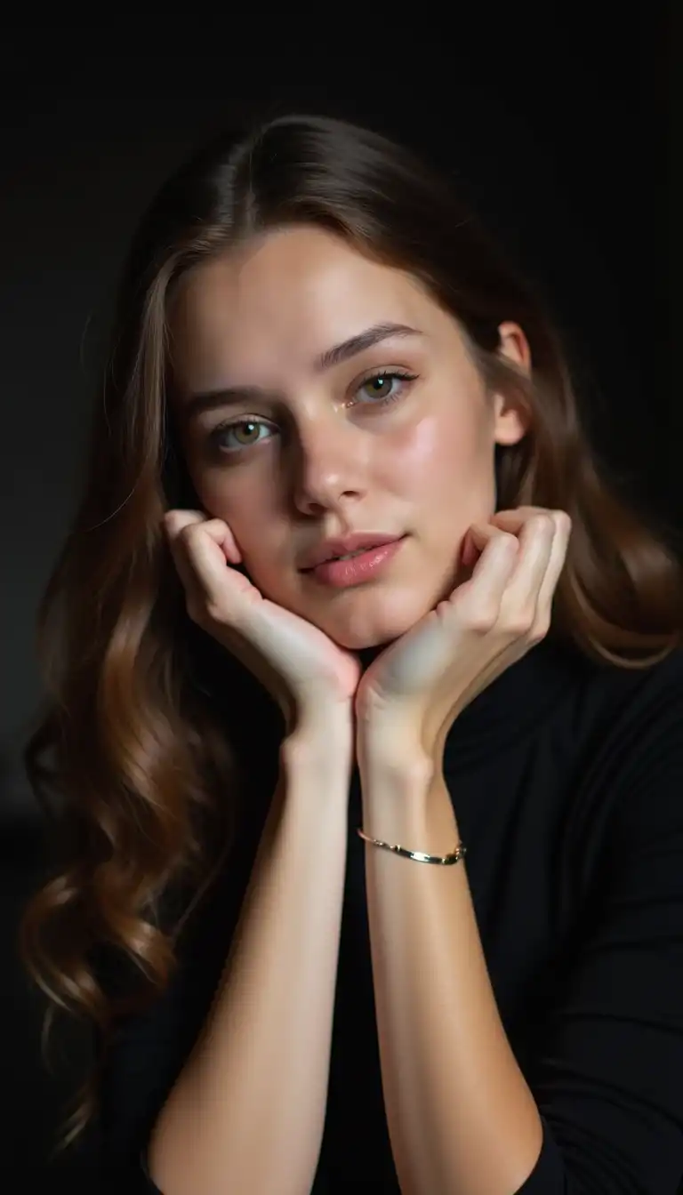 photograph of an alluringly beautiful woman, light-blue eyes, long blonde hair with dark highlights, fair complexion, high angle, smiling, wearing an open blouse, underwear, sitting on the floor leaning on a couch, looking up at the viewer, leather couch, book cases behind the couch, stone floor with area rug