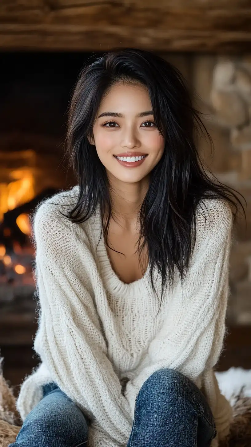A young, captivating woman poses on a futuristic bench near a modular synthesizer, her body positioned to emphasize her sleek lines and rounded form. Her glossy silver latex leggings and top hug her figure, the metallic sheen reflecting the colorful lights from the nearby screens. Her fingers hover above the synthesizer's controls, the alluring silhouette heightened by the form-fitting clothing. Beside her, the synthesizer’s complex wiring mirrors her own intricacy, producing a captivating futuristic atmosphere.