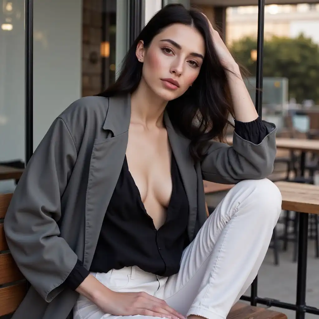 一位年轻,迷人的女人在模块化合成器附近的未来派长凳上摆姿势,她的身体定位于强调她圆滑的线条和圆润的外形。她光滑的银色乳胶绑腿和上衣拥抱着她的身材,金属光泽反射了附近屏幕上的五颜六色的灯光。她的手指悬停在合成器的控件上方,合身的衣服使诱人的轮廓更加突出。在她旁边