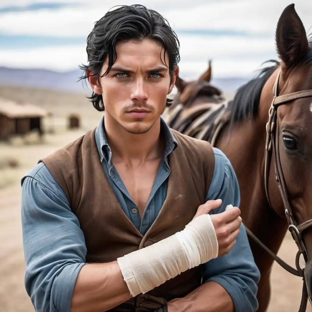 handsome young, black hair young man with icy blue eyes, sickly, thin, skinny, sickly, injured, classic hand injury wrap, both wrists with bandage, injured western setting, world, resistance, rebels, underground, gritty, sitting a table