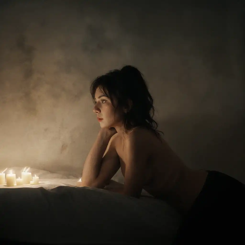 This is a photograph of a woman with long brunette hair hanging to one side of her head wearing a loose tank top with a plunging neckline. With her head turned she stairs at the viewer with her light colored eyes. The sun is shining and fills the scene with warm light. casting shadow style, silhouette style Negative prompt: makeup