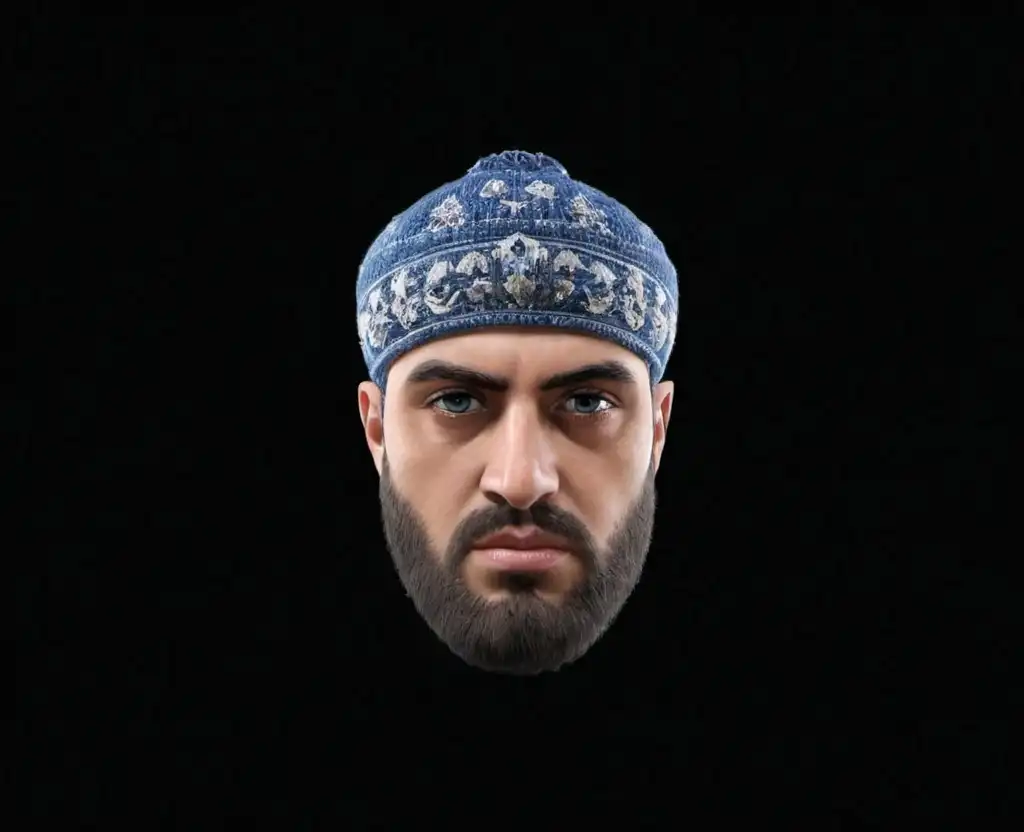 一个矮小的商人,胡子梳得很整齐,皮肤晒得黝黑,胡子上扎着辫子,一副和蔼的样子,手里拿着一杯啤酒