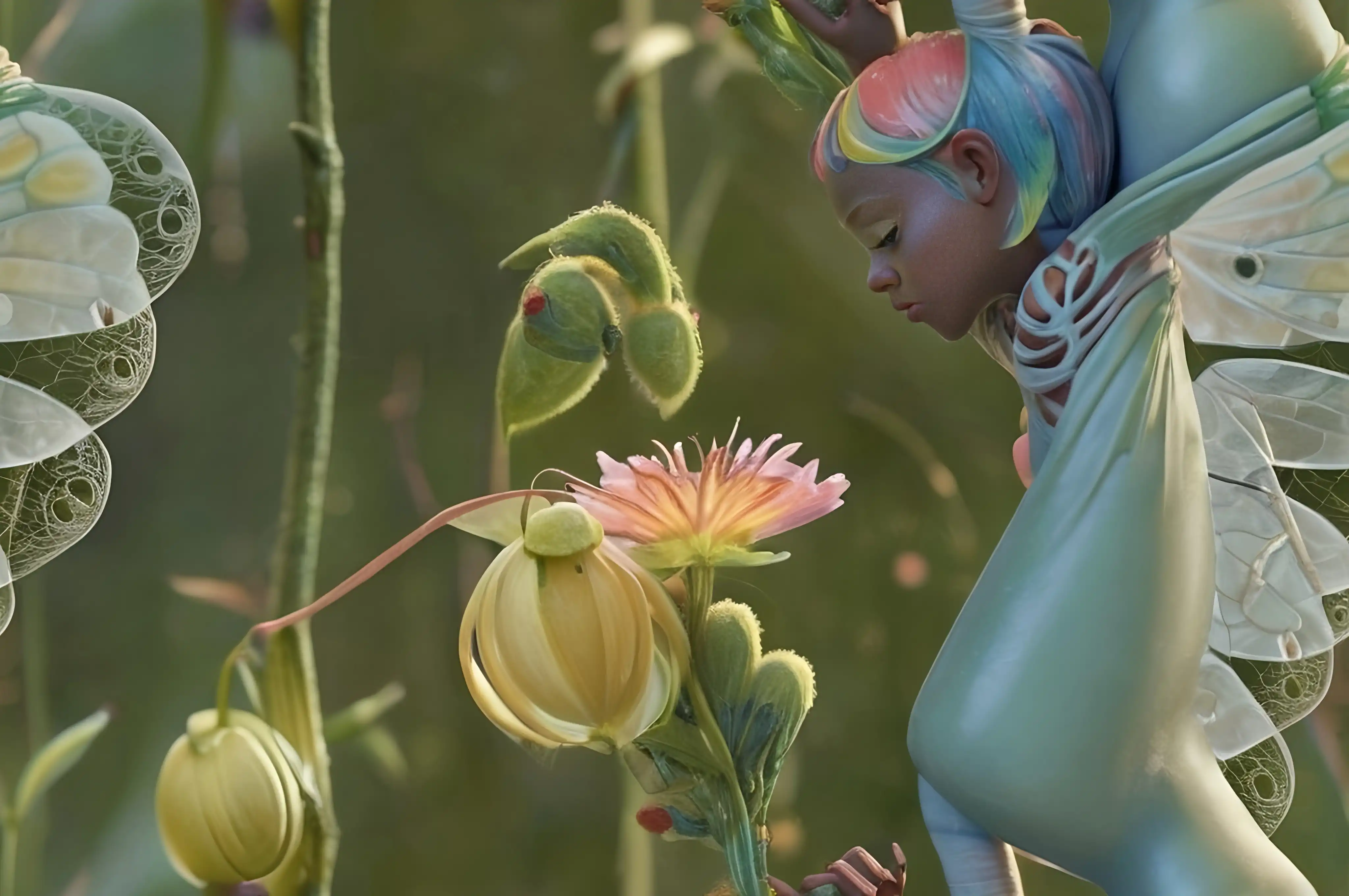 一幅画,一个穿着黄色连衣裙的女孩在空中飞舞,蜜蜂在她周围,背景是一朵云,布拉德·昆克尔,非洲未来主义,专辑封面,专辑封面