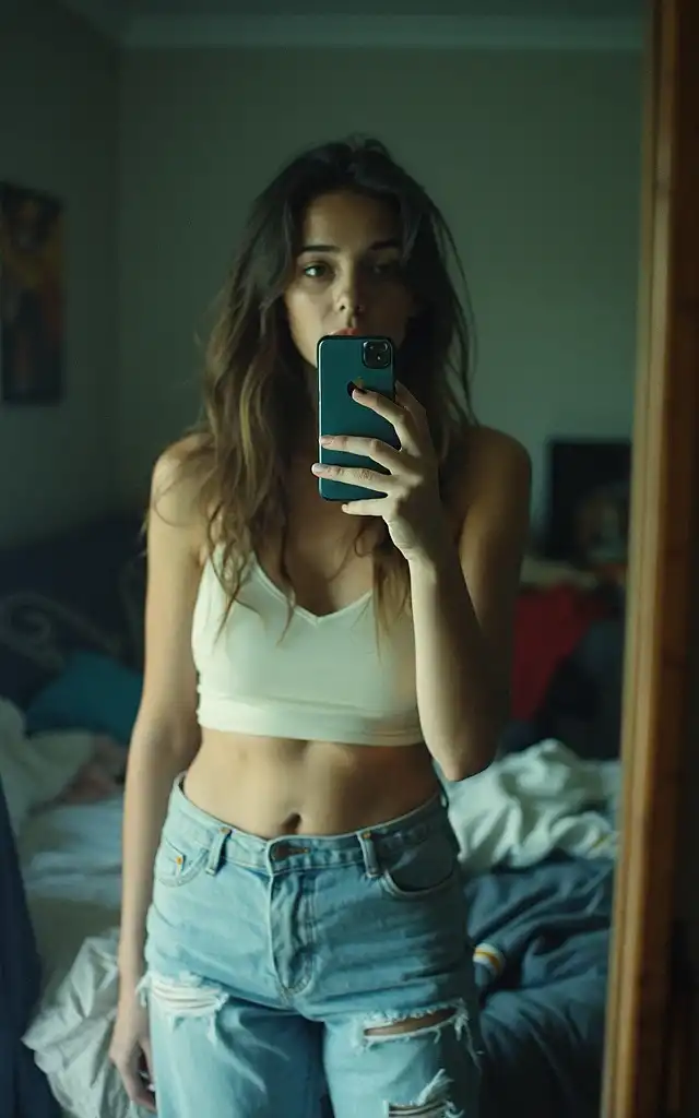A highly attractive blonde woman who is a flight attendant is taking a selfie in an airplane bathroom. She is wearing navy blue lace lingerie. The photo is taken with a high-resolution camera.