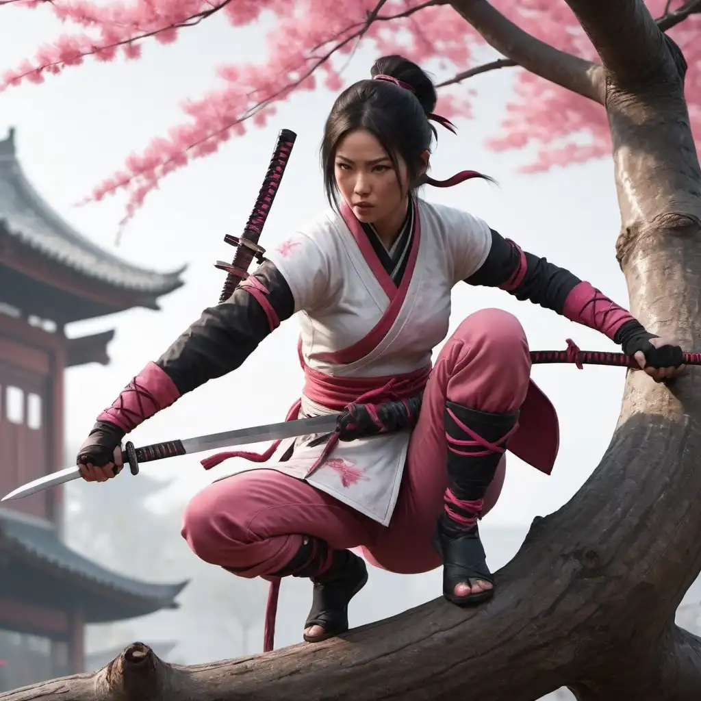 An gorgeous Asian kunoichi holding kunai in her hand, sitting on a tree branch, before jumping on a rich passerby speaking with two others people. chinese scene, full scene, hyperrealist,4k, assassin's creed